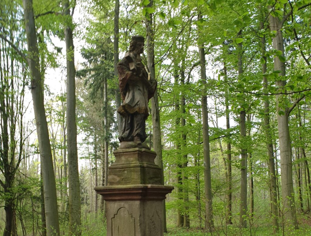 Novobarokní socha od Josefa Seiche. Původně nesla typické atributy světce – model kostela a sekeru/biskupskou berlu.